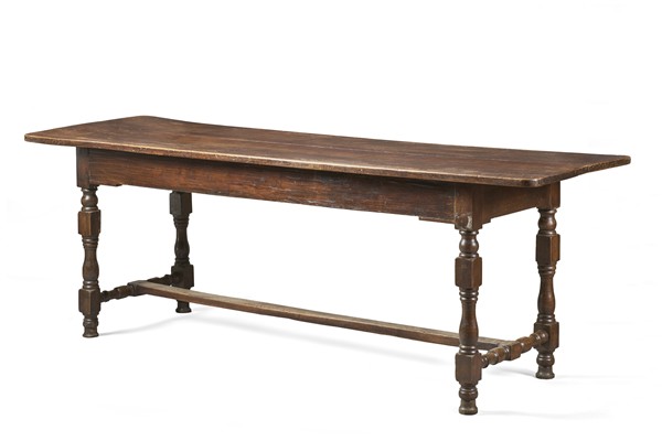 Tavolo in noce di forma rettangolare con gambe e traverse tornite a rocchetto. Toscana, secolo XVII (cm 242x81,5x74) (difetti e restauri)