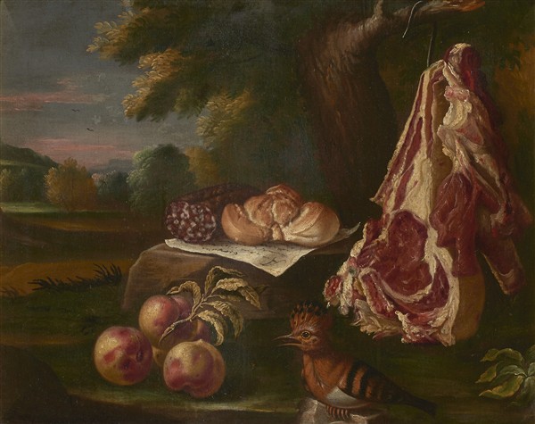 "Composizione con pane e salame, carne, frutta e un'upupa in un paesaggio"