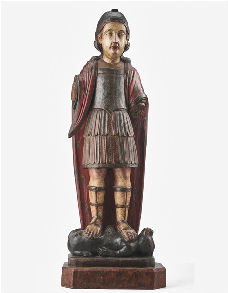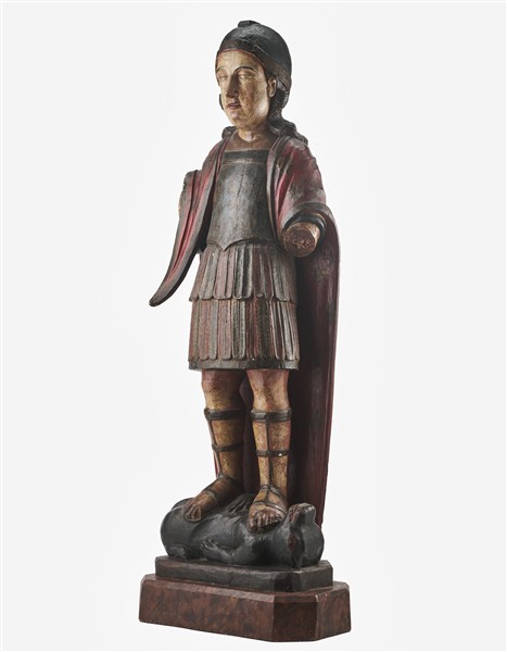 Brazilian art, early 18th century. Saint Michael the Archangel, a polychrome wood sculpture (h. cm 105) (defects)