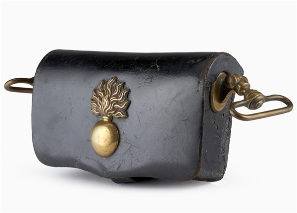 Grande Giberna della Gendarmeria a cavallo. Francia, Terza Repubblica, modello 1872. Scatola in legno rivestito in pelle cerata. Patta decorata da una placca in ottone con bomba fiammeggiante, emblema di granata, internamente impressa "A. GODILLOT, PARIS". Lati in ottone dorato con perni per la cintura (cm 20x10) (difetti)