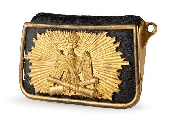 Guard Artillery officer's cartridge pouch. France, Second Empire (1852 - 1870) Wooden box covered in waxed leather and fabric on the back, golden brass frame centered by a golden brass plaque with a radiant sun with a crowned imperial eagle on two crossed cannons (cm 15x9) (defects)