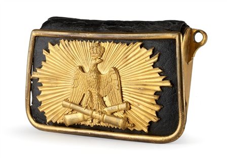 Giberna da ufficiale di Artiglieria della Guardia. Francia, Secondo Impero (1852-1870) Scatola in legno rivestito in marocchino cerato e foderato in tessuto al retro. Linguetta in vernice nera bordata da una cornice in ottone dorato, il centro decorato da una placca in ottone dorato con sole raggiante con fissata un'aquila imperiale coronata in rilievo poggiante su due cannoni incrociati. Lati in ottone dorato con perni per la cintura (cm 15x9) (difetti)