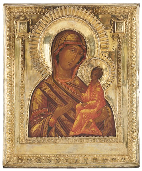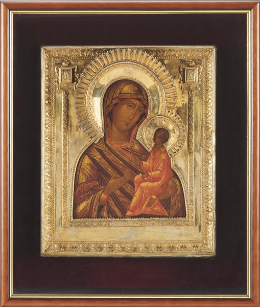 Russian art, 19th century. Tempera icon on panel depicting the Madonna of Tikhvin with a silver-gilt and embossed riza. Moscow, 1813. Assayer Vichlyaev Ivan (1802-1818) (36x28 cm) in modern case (52x44 cm) (defects)