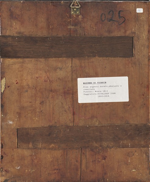 Arte russa, secolo XIX. Icona a tempera su tavola raffigurante la Madonna di Tichvin con riza in argento dorato e sbalzato. Mosca, 1813. Saggiatore Vichljaev Ivan (1802-1818) (cm 36x28) in teca moderna (cm 52x44) (difetti)