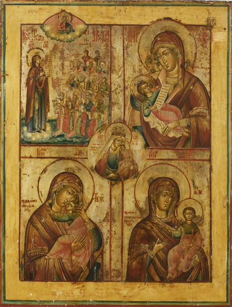 Russian art, 19th century. A quadripartite tempera and gold icon on panel depicting four Mothers of God (53x69 cm) (defects and restorations)