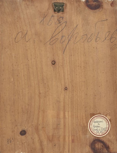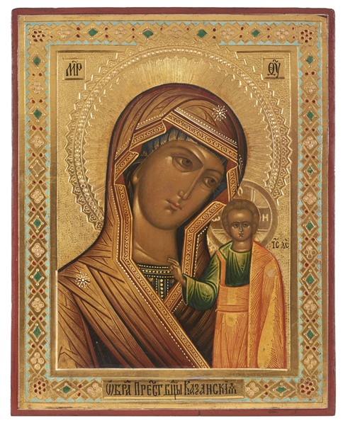 Russian art, 19th century. Palek School. Tempera and gold icon on panel depicting Our Lady of Kazan (18x22.5) (defects)