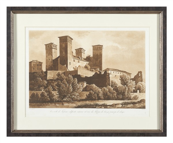 Autori vari del secolo XIX. Castelli piemontesi, gruppo di quattro acquetinte, in cornici