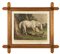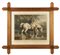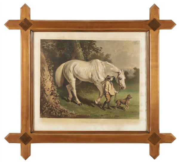 Gruppo di quattro incisioni a colori raffiguranti scene di vita con cavalli (cm 60x67) in cornici in legno sagomato e decorato a motivi romboidali. Francia (difetti)
