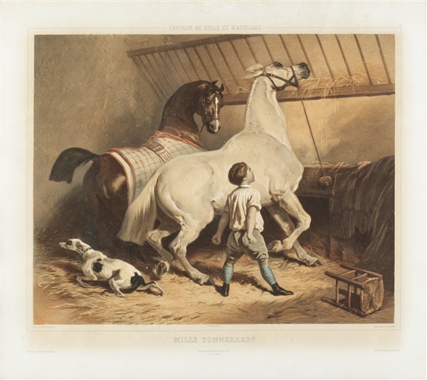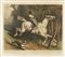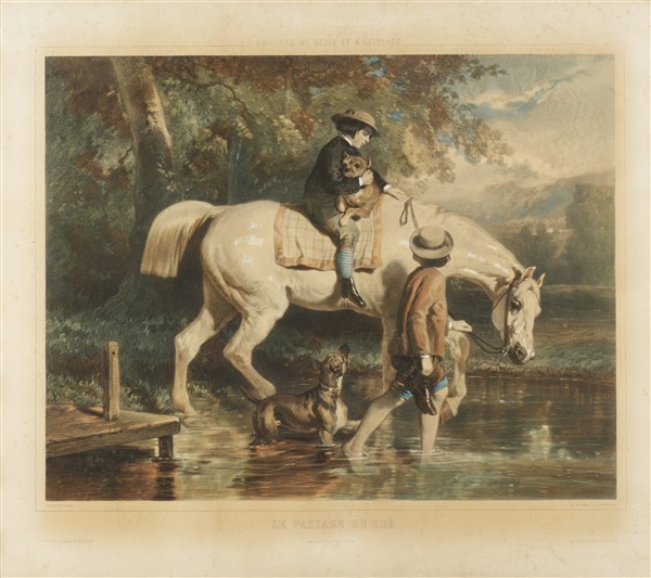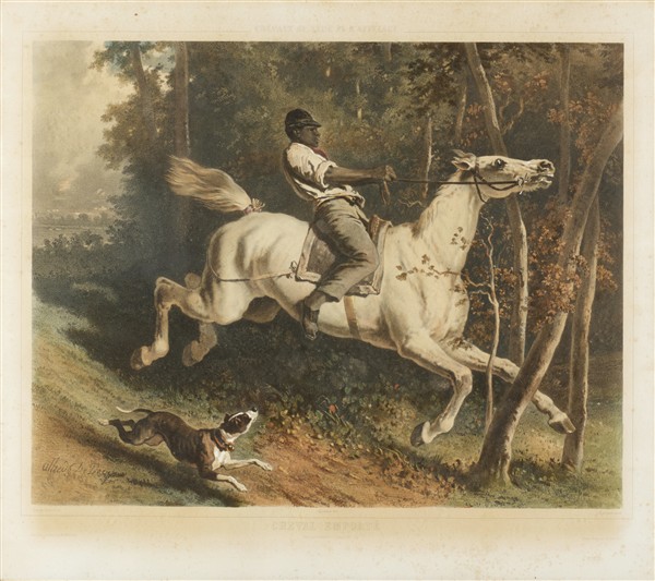 Gruppo di quattro incisioni a colori raffiguranti scene di vita con cavalli (cm