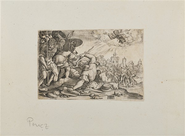 Lot consisting of a burin by Hans Sebald Beham depicting "Peasants' Brawl", a burin by Barthel Beham depicting "Cimon and Pero" and two burins by Georg Pencz, one depicting "Conversion of St. Paul" and the other depicting "Medea and Jason" (serious defects), of different sizes.