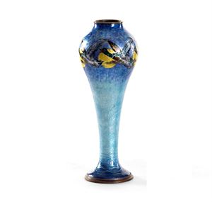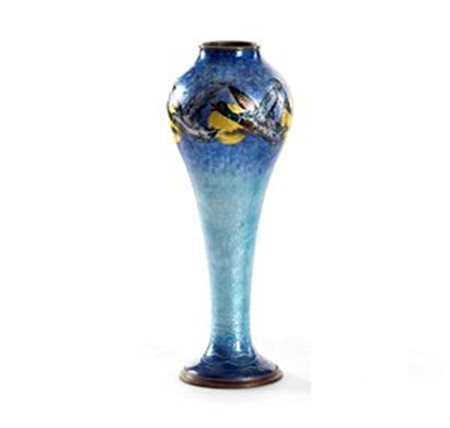 LIMOGES Vaso agli smalti a decoro champlevé di anitre selvatiche. Epoca 1930 ca H 24,2 cm Firma: C. Fauré Limoges Piccolo restauro sull'ala di un'anitra Bibl.: Camille Fauré Limoges Art Déco Enamels The Geometry of Joy, ripr.a pg.67