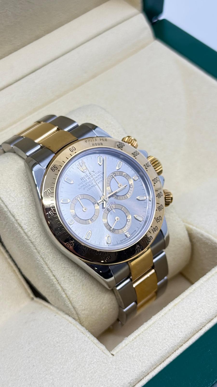 Marca Rolex Modello (Orologio) Daytona Numero di referenza 116523 Carica Automatico Materiale della cassa Oro/Acciaio Materiale cinturino Oro/acciaio Anno 2005 documenti originali Rolex, no box, la scatola viene utilizzata solo per fotografie non è in vendita Calibro Carica Automatico Cassa Materiale della cassa Oro/Acciaio Diametro 40 mm Impermeabile 10 ATM Materiale lunetta Oro giallo Vetro Vetro zaffiro Cinturino Materiale cinturino Oro/acciaio Colore cinturino Oro/acciaio Chiusura Déployante Materiale chiusura Oro/Acciaio Funzioni Cronografo - COMMISSIONE D’ASTA 25%
