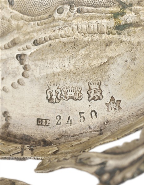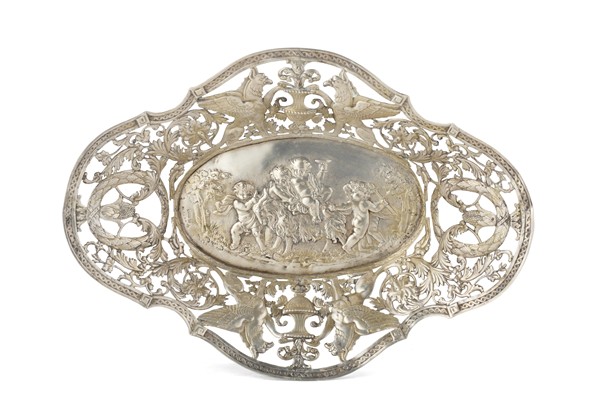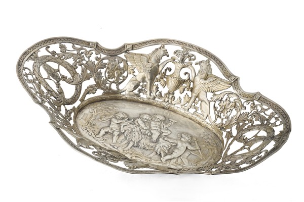 Cesto in argento con bordura traforata, incisa e sbalzata a grifoni, vasi e volute, cavetto decorato con baccanale. Centro Europa, inizio secolo XX (g 420) (cm 36,5x7,5x26) (difetti)