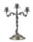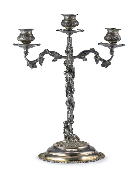 Candelabro a tre fiamme in argento inciso con due figure abbracciate ad un fusto a tralci di vite con foglie e grappoli d'uva a rilievo, base circolare con profilo mistilineo. Argentiere F.C. (g 1300) (cm 25x32) (difetti)