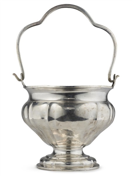 Silver blessing bucket with ribbed body and curved handle. Papal States, 19th century. Silversmith VR (g 700) (h. cm 31,5; d. cm 17,5) (defects)