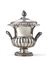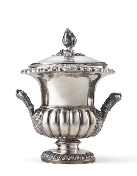 Zuccheriera biansata in argento a corpo costolato, presa del coperchio a bocciolo con foglie sbalzate all'attacco, anse a racemi fogliati. Torino, secolo XIX. Argentiere Carlo Balbino (g 500) (h. cm 20,5) (difetti)