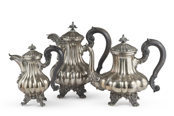 Part of tea and coffee silver service composed of teapot, coffee maker and milk jug with ribbed bodies decorated with masks and foliated scrolls, rocailles feet, shaped wooden handles. Lombardo-Veneto, second half of the 19th century (g gross 2000) (h. max cm 27) (defects)