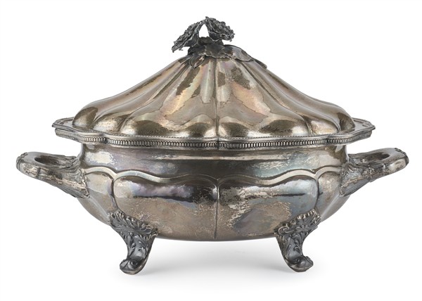Zuppiera biansata con coperchio in argento con presa in forma di fiori e foglie a tutto tondo, baccellata, bordi perlinati, anse con rami fioriti, piedi a rocaille (g 3400) (cm 47x31x40) (difetti e restauri)