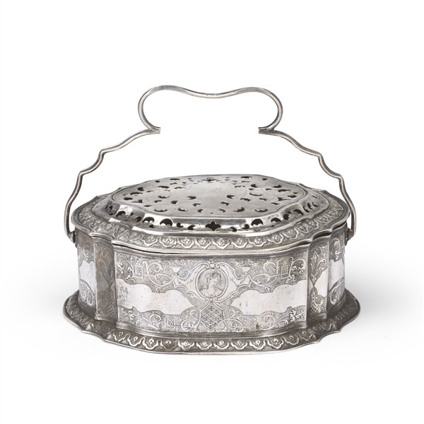 Scaldino in argento con coperchio traforato a motivi stilizzati, fascia incisa e cesellata a motivi alla Bérain, mascheroni e profili entro ovali, profili decorati da elementi concatenati di campanule e tendaggi, manico basculante di forma sagomata. Milano, Bottega all’Insegna del Carciofo, fine del secolo XVIII-inizio del secolo XIX (g 900) (cm 25,5x9,5x18,5) (difetti)