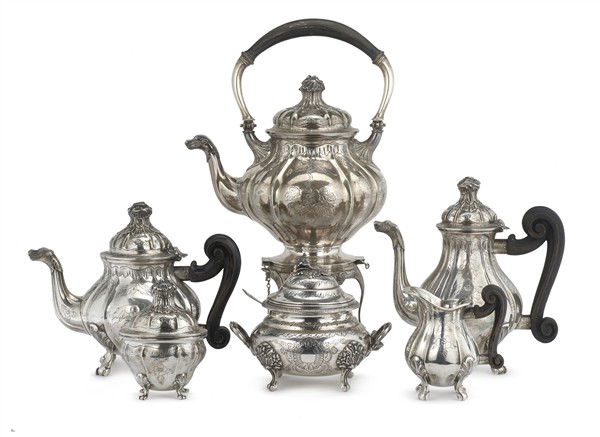 Servizio da tè e caffè in argento sbalzato con corpo costolato e prese rocailles, alcuni manici ebanizzati, composto da: samovar, teiera, caffettiera con beccucci zoomorfi, lattiera e zuccheriera. Uniti ad una zuccheriera biansata torinese dell'argenteria Galbia (g lordi 4000) (h. max cm 45,5) (difetti)