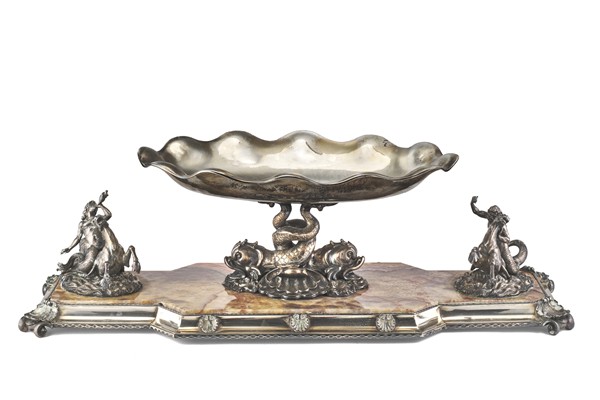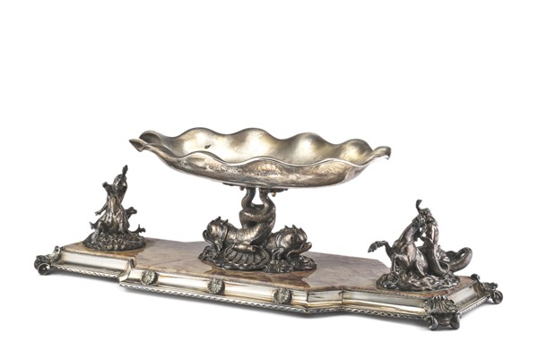 Grande centrotavola in argento poggiante su base sagomata in alabastro fiorito sormontato al centro da vasca con montanti a delfini a tutto tondo con code incrociate e ai lati da tritone e sirena a cavallo. Base con cornice decorata a valve di conchiglia, piedi a ricciolo. Milano, 1940 circa (cm 77x24x30) (lievi difetti e mancanze)