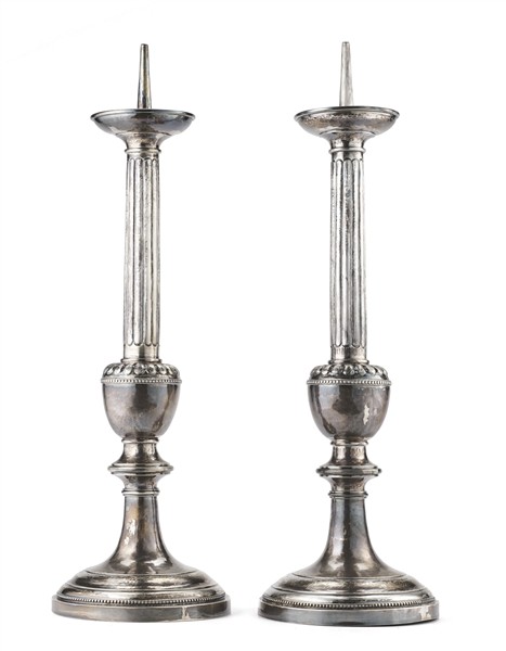 Coppia di torciere in argento con fusto a colonna scanalato su base circolare g