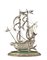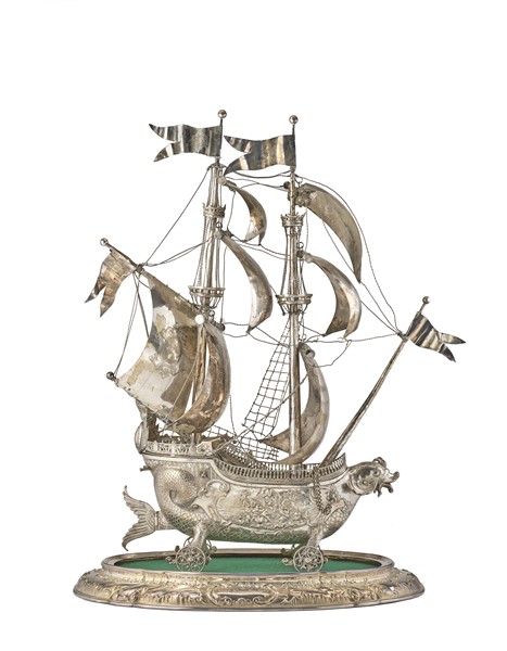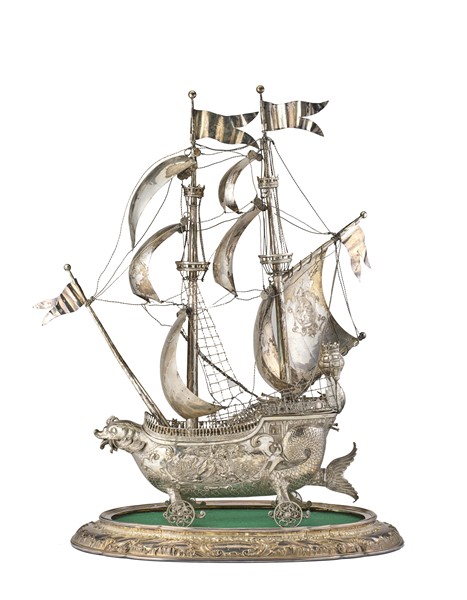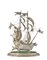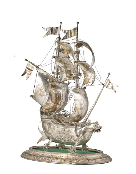 Portabottiglie in forma di galeone in argento inciso e sbalzato su base ovale c