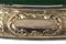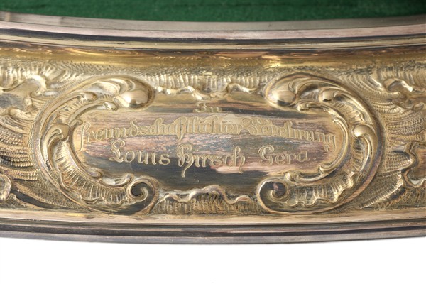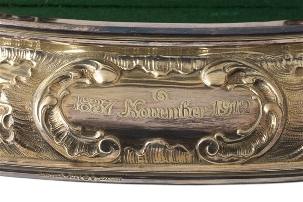 Silver bottle holder in the shape of a engraved and embossed galleon, oval base with rocailles decoration, scroll with inscription for a probable anniversary of 6 November 1837 - 1912. First half of the 20th century (3300 g) (cm 52x70x18). Oval wooden base with engraved and embossed silver frame, foliated scroll decoration with inscribed cartouches (cm 53x35) (defects)