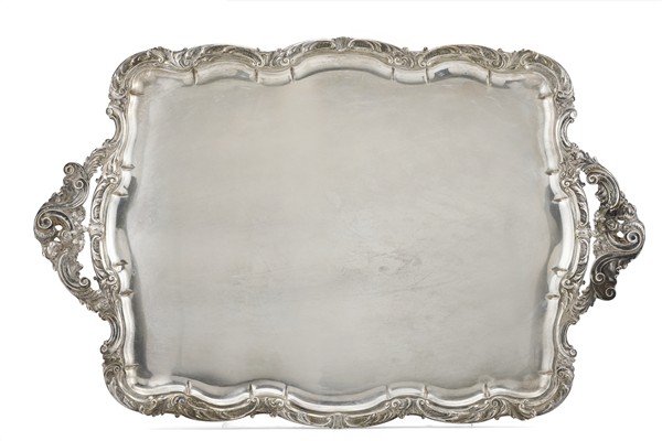 Grande vassoio biansato con bordura e prese decorate in rilievo a volute fogliate e fiori (g 4500) (cm 73x47) (difetti)