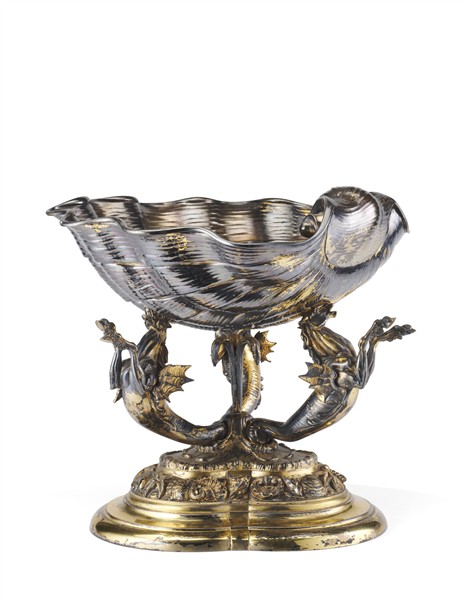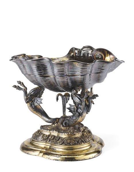 Grande centrotavola in argento e vermeil con vasca in forma di valva di conchig