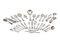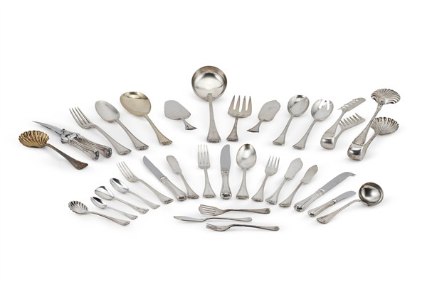 Servizio di posate in argento composto da ventiquattro forchette, dodici forchette da pesce, forchette piccole, coltelli grandi, coltelli piccoli, coltelli a lama seghettata, coltelli da pesce, coltelli da burro, cucchiai, cucchiaini, cucchiai da gelato, cucchiaini da caffè, quindici posate a servire, dodici piccole posate a servire, quattro cucchiai a servire a forma di conchiglia. Alessandria, argentiere Ricci e Cesa (g pesabili 8500) (difetti)