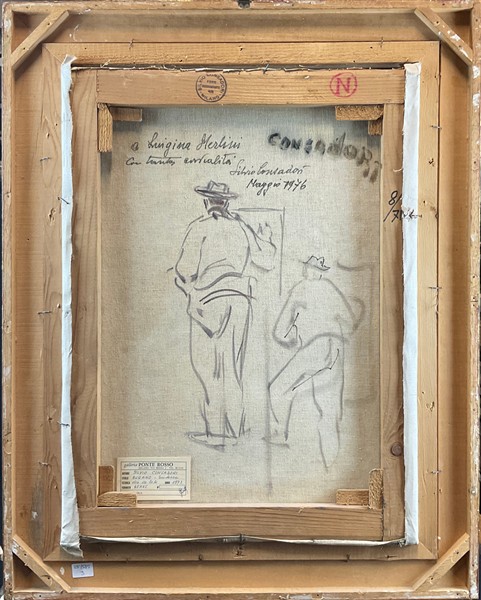 al retro: bozzetto con figure, firma, dedica, timbri e cartiglio