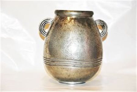 DELAVAN R. Vaso in metallo martellato con anse. Epoca 1930 H 17,8 cm Firma R....