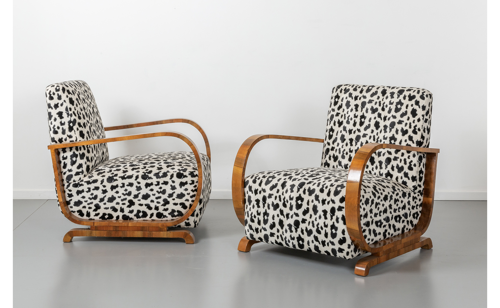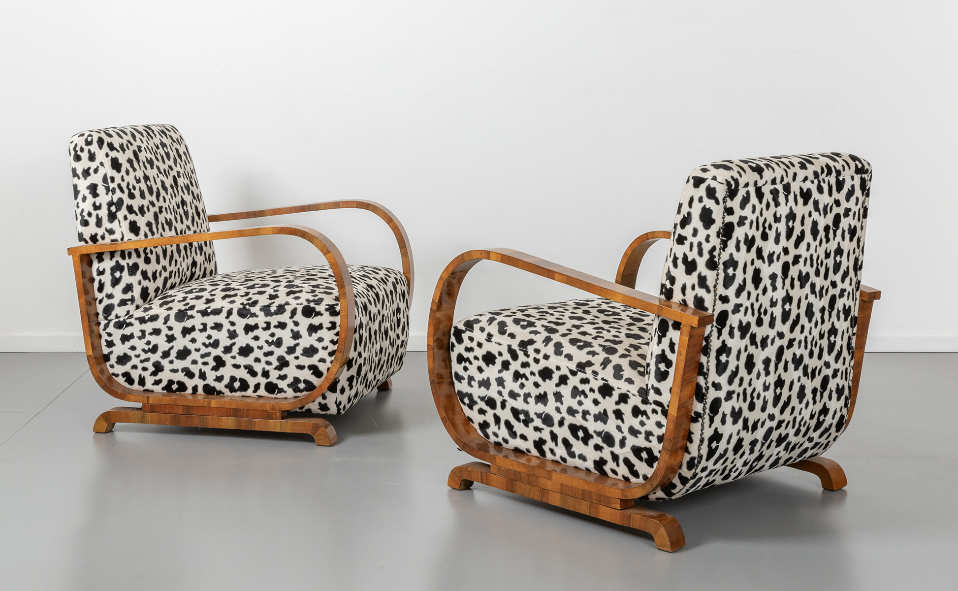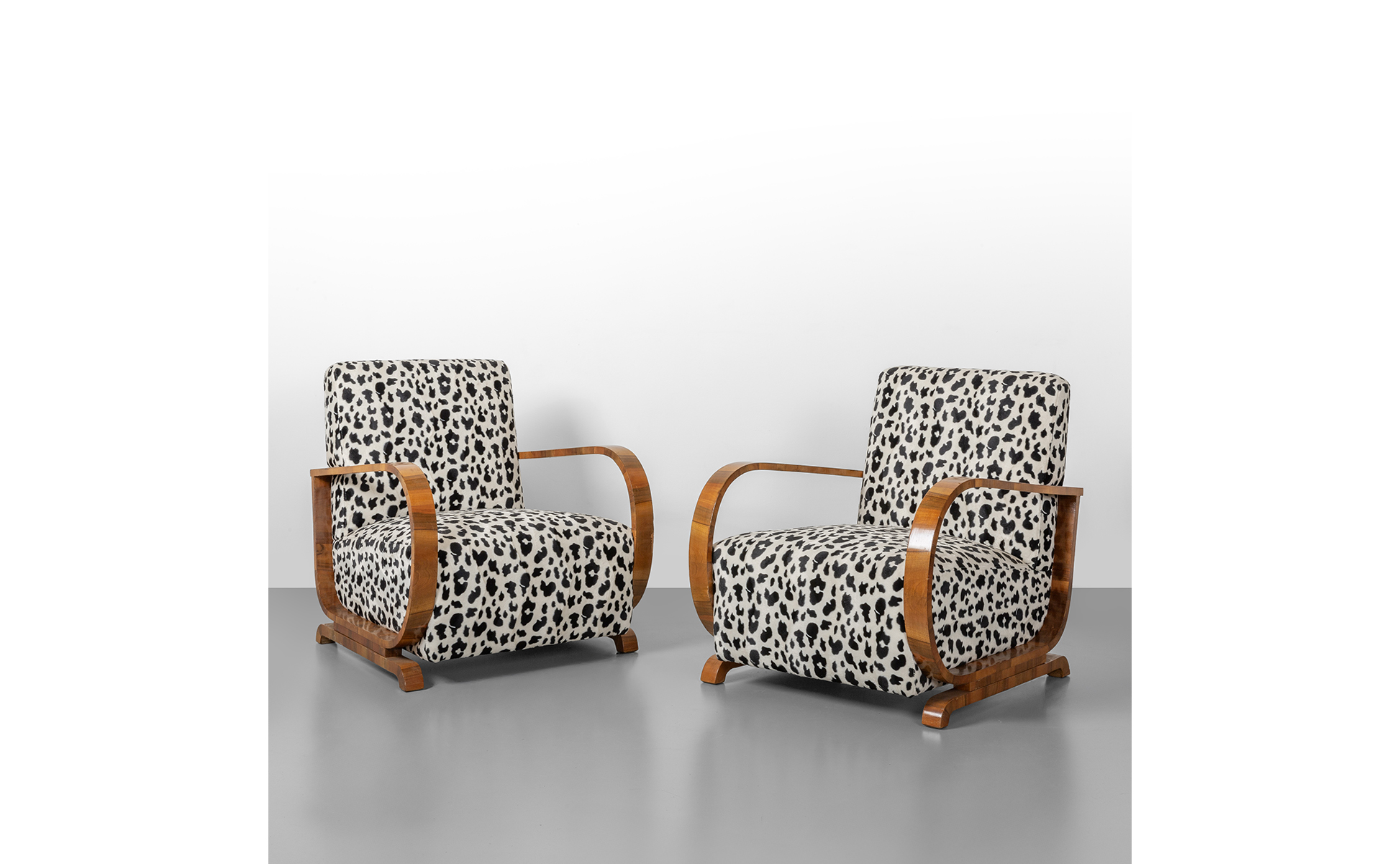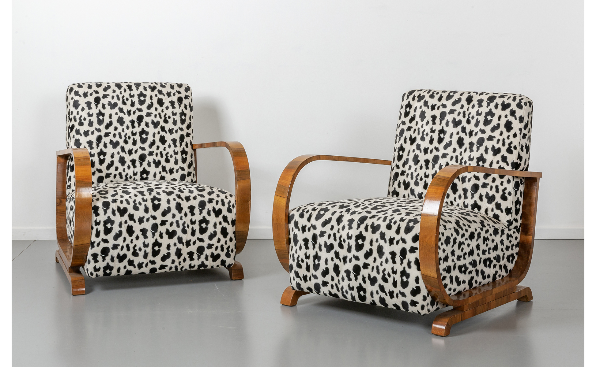 Legno di noce imbottiture rivestite in tessuto pelo leopardato.