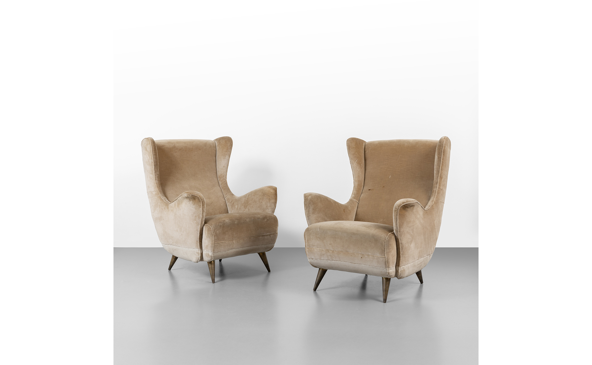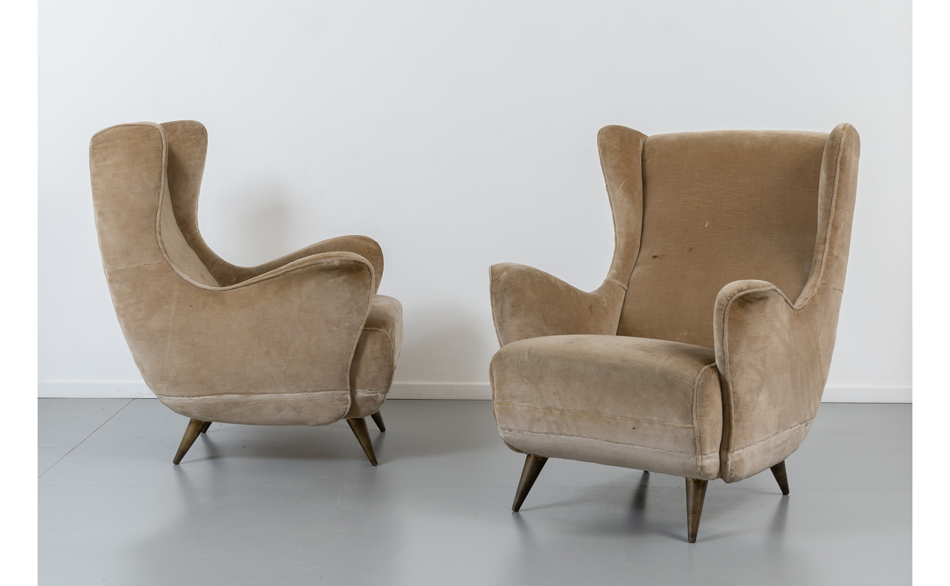 Strutture in legno gambe rivestite in ottone imbottiture rivestite in velluto.