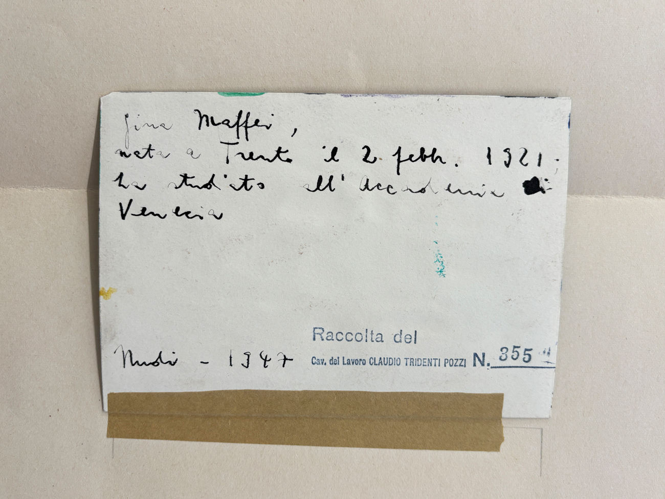Timbro della Raccolta Claudio Tridenti Pozzi con numero di repertorio al retro
