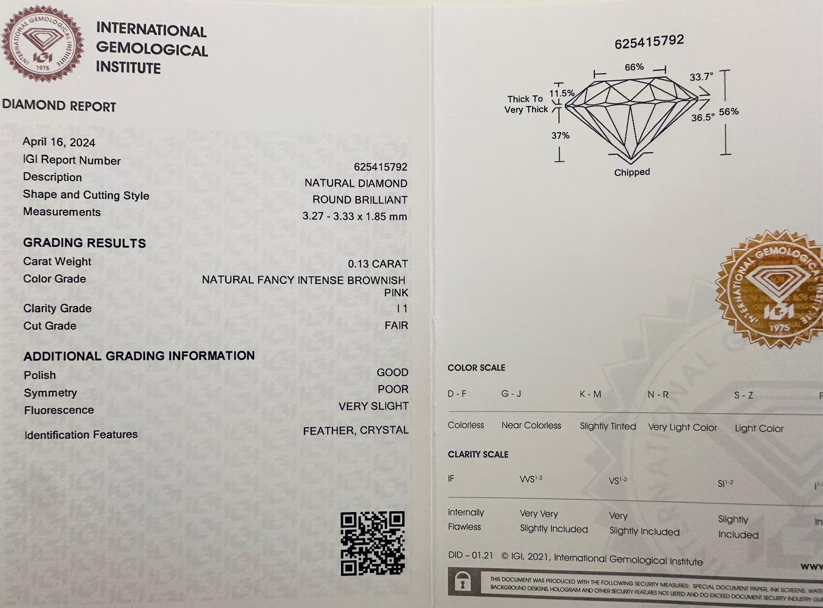 DIAMANTE NATURAL POLISHED 0,13 FANCY ROSA INTENSO MARRONCINO - PUREZZA I1 - CERTIFICATO IGI - AM40301-3 - COMMISSIONE D’ASTA 25%