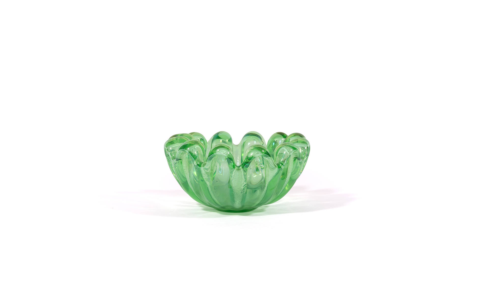Una coppa rotonda a conchiglia in vetro verdino iridato.