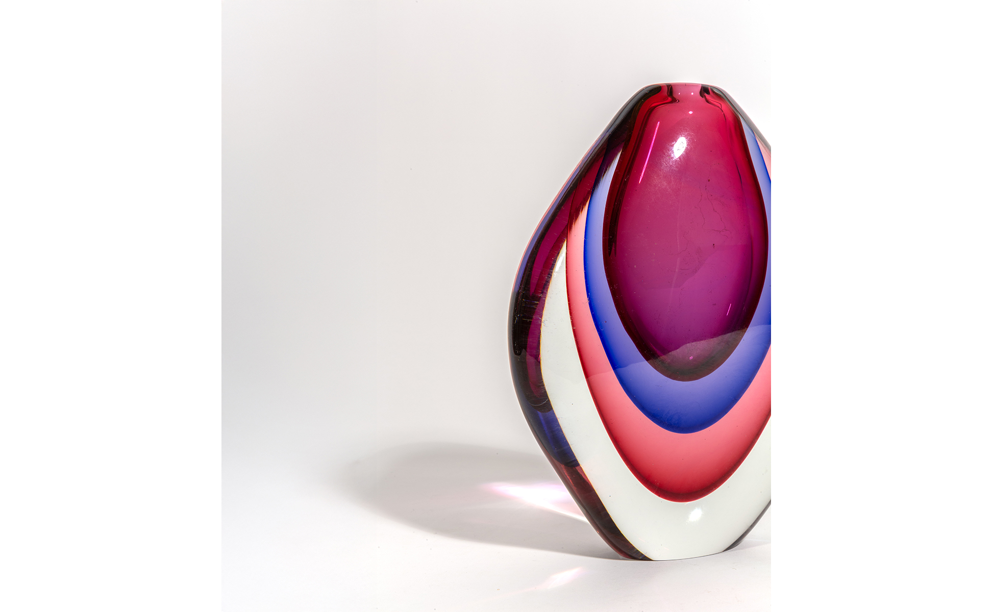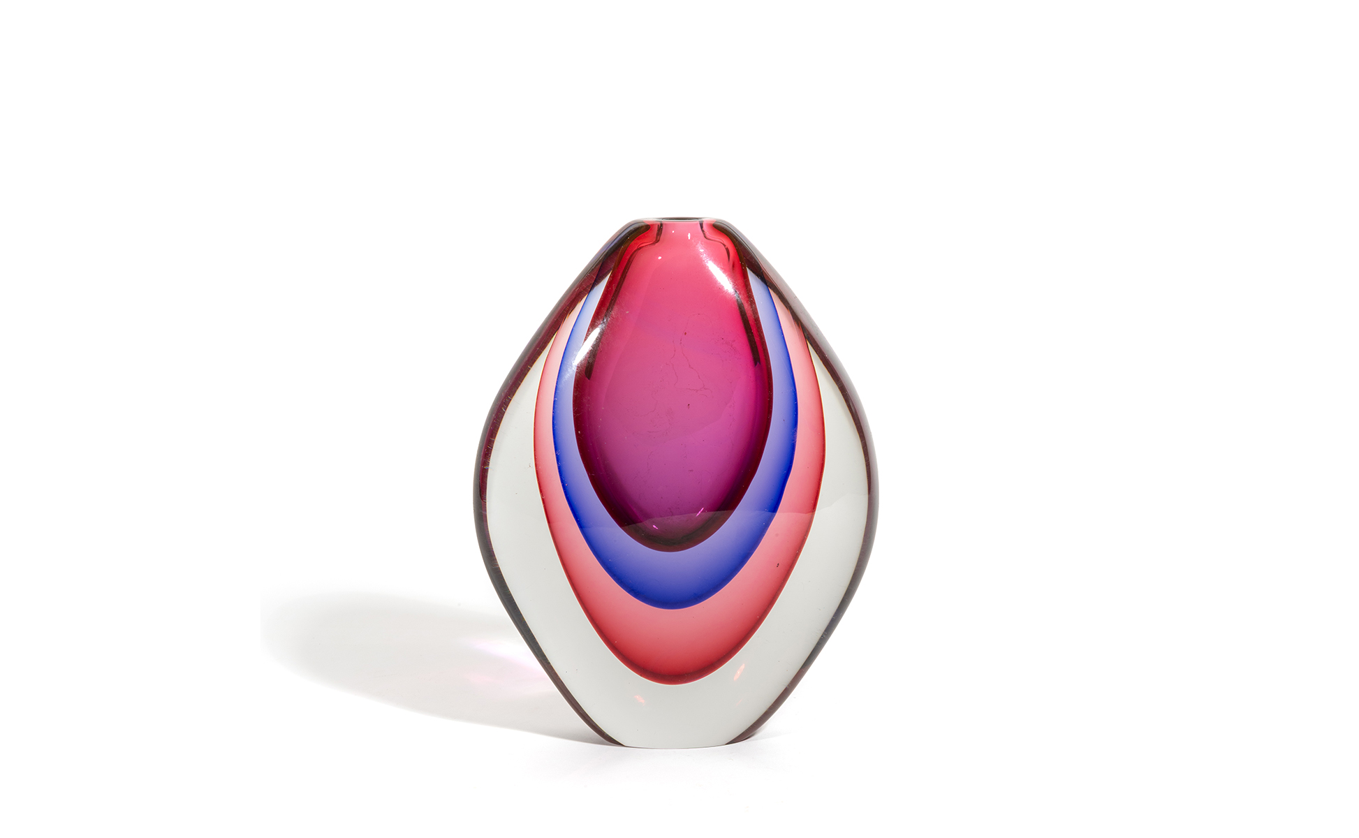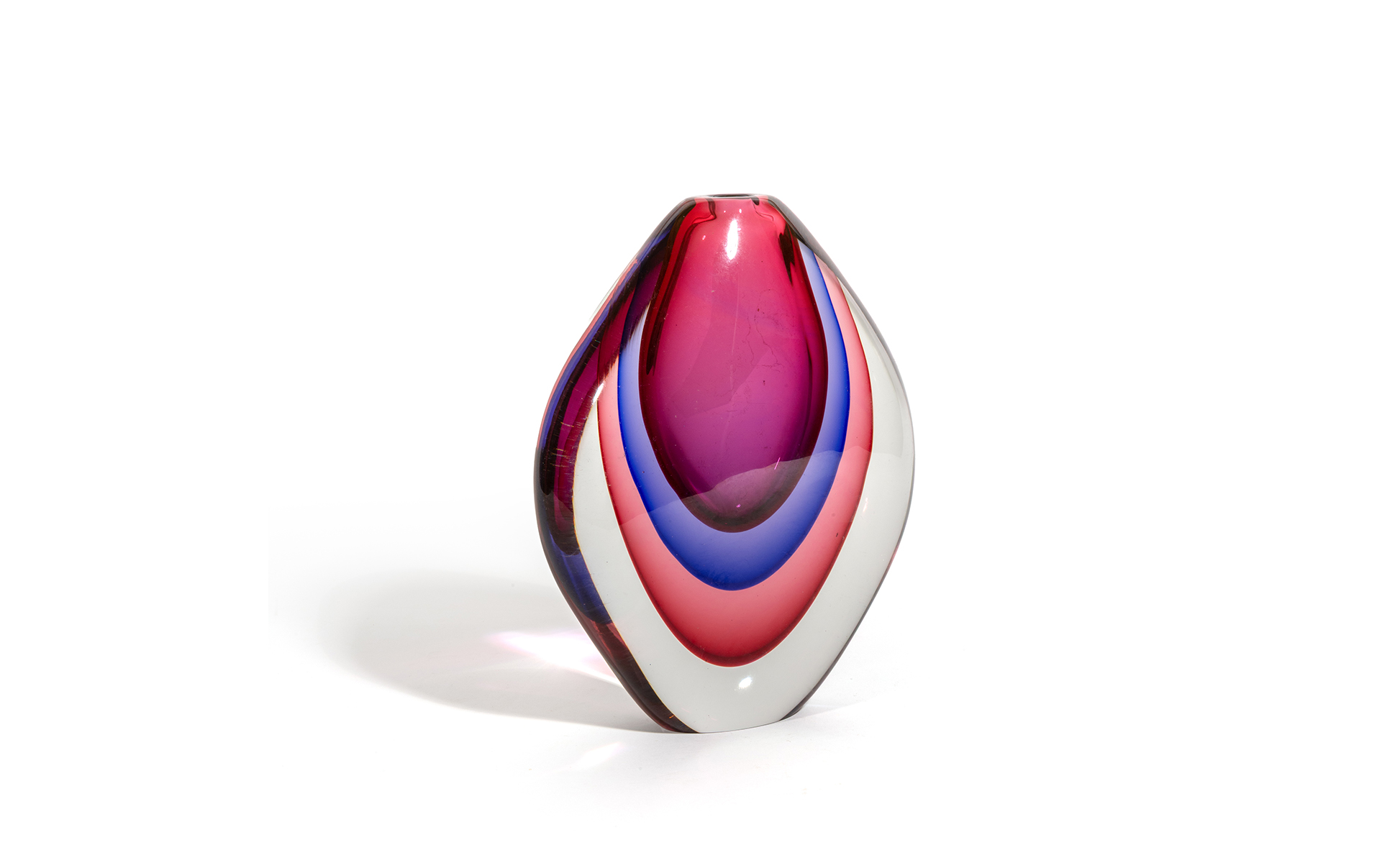 Un vaso a goccia in vetro sommerso blu e rubino.
