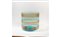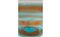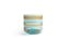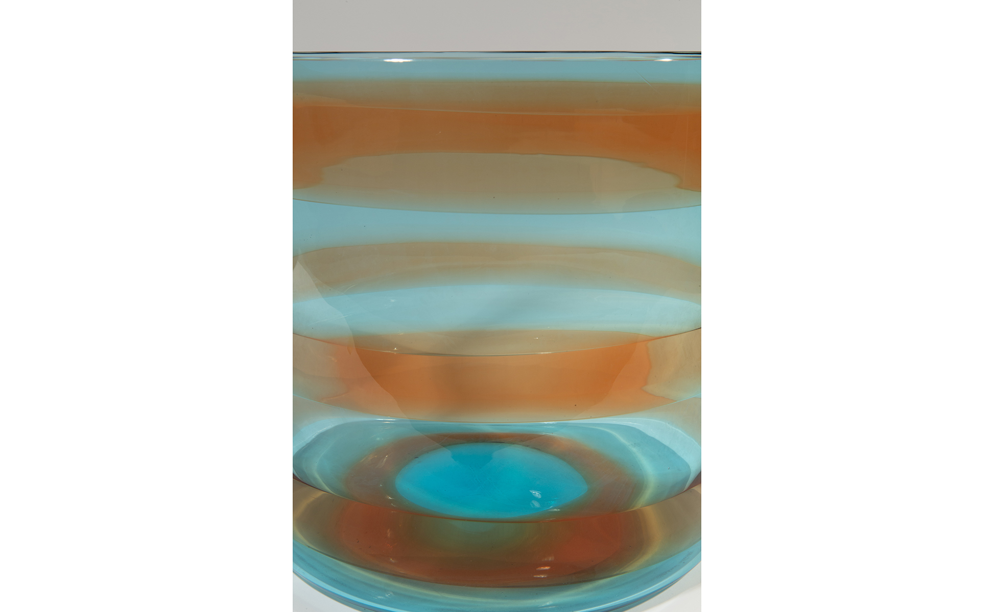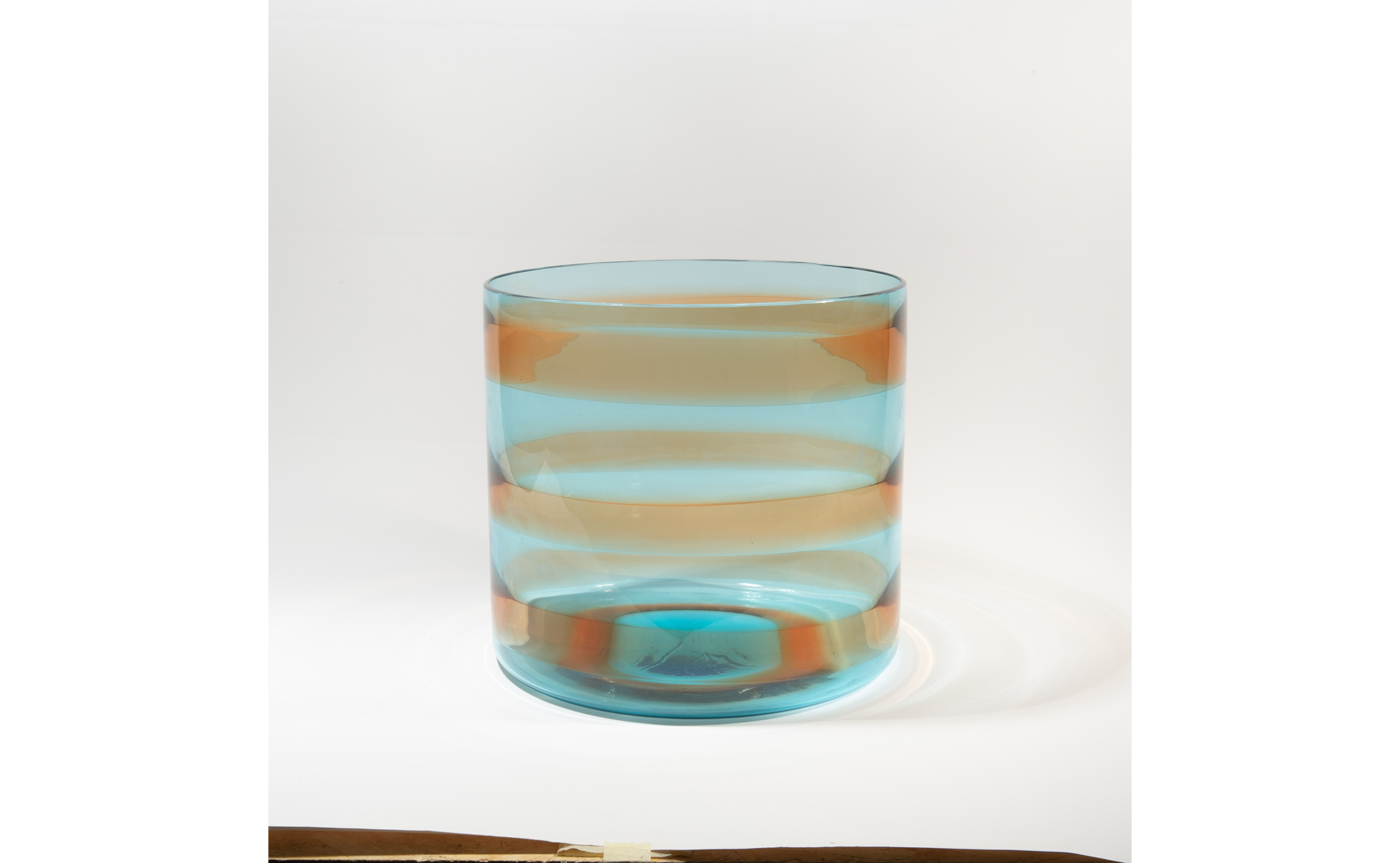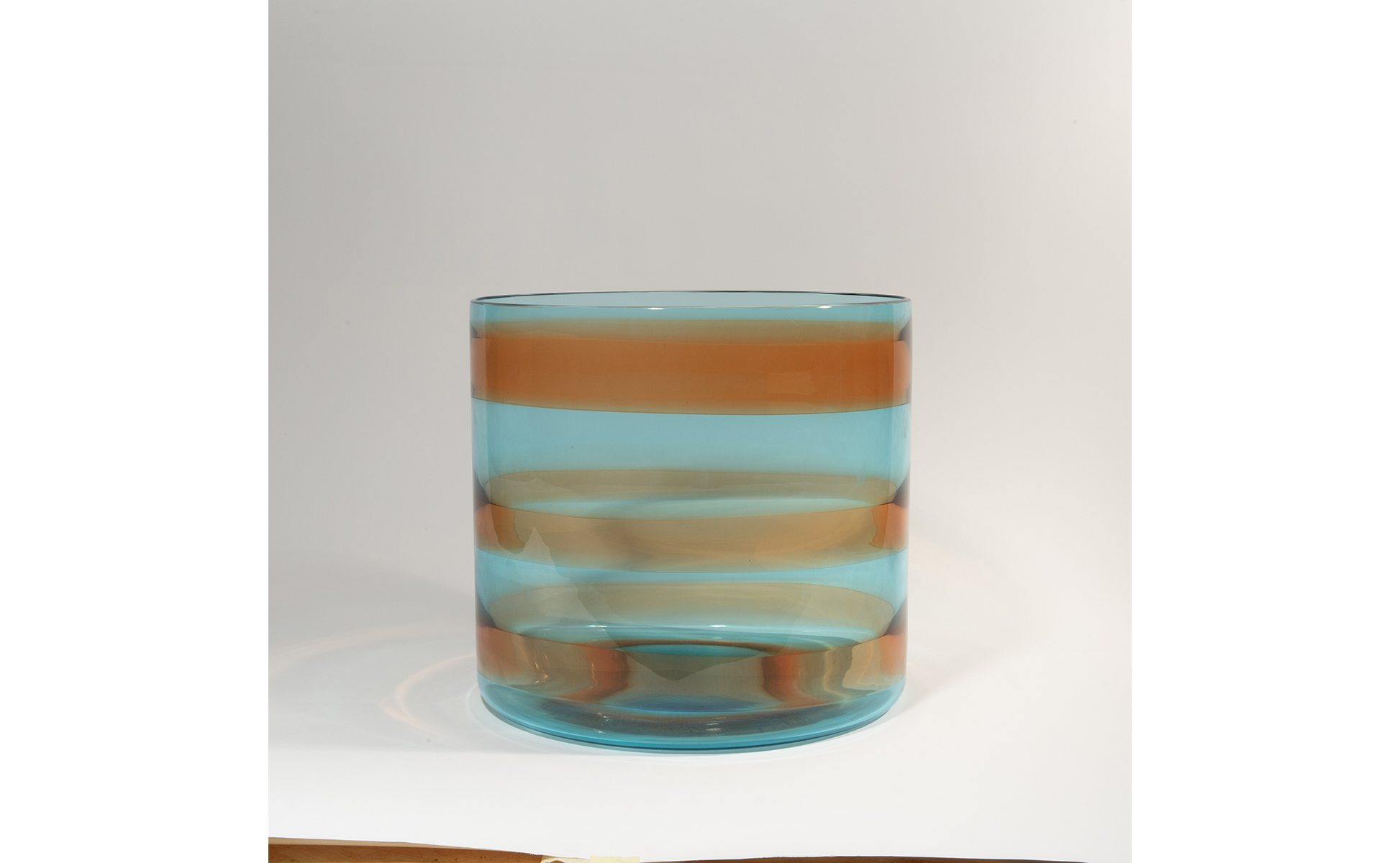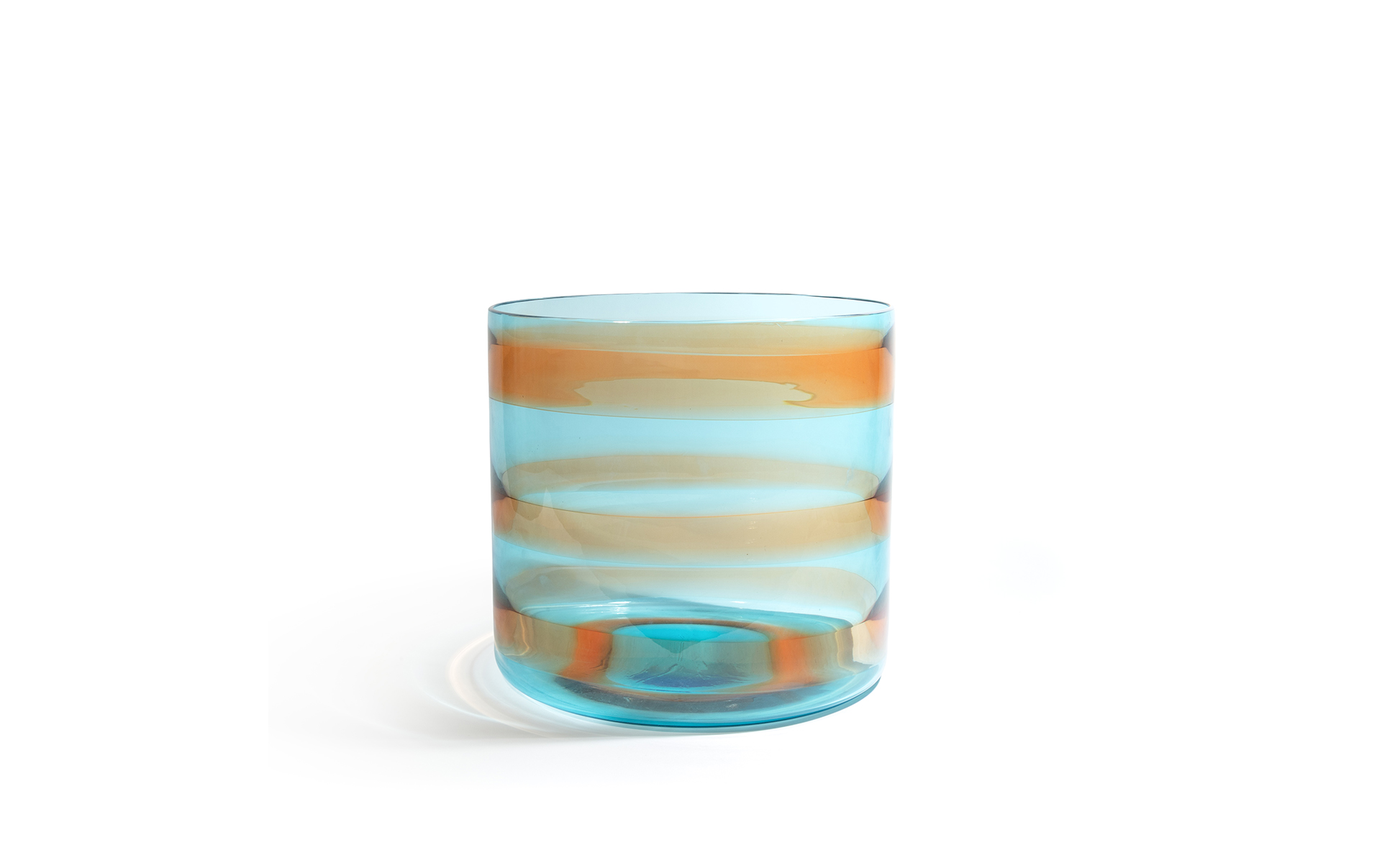 Un grande vaso cilindrico in vetro trasparente acquamarina con fasce orizzontali ambra.