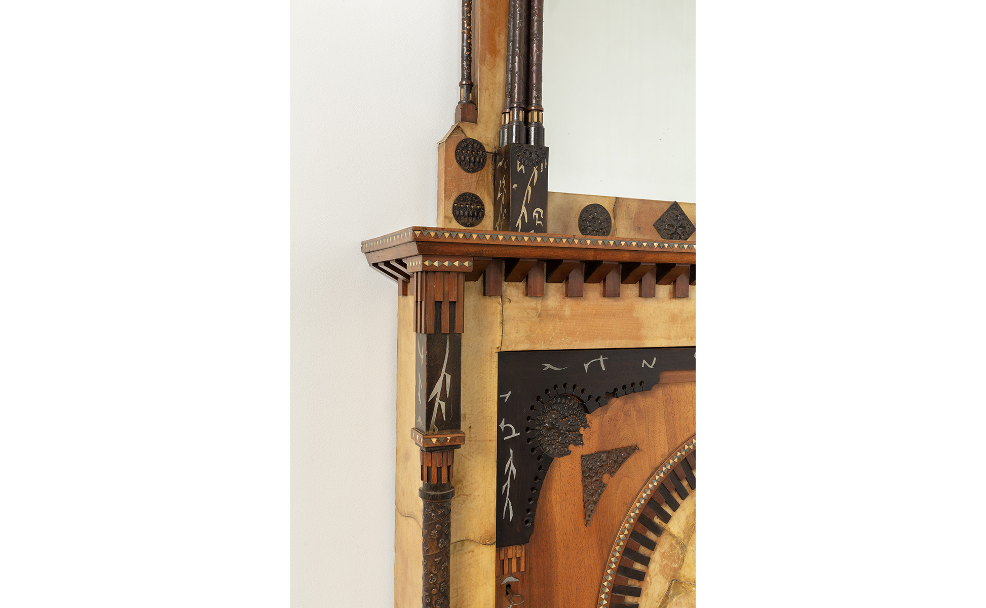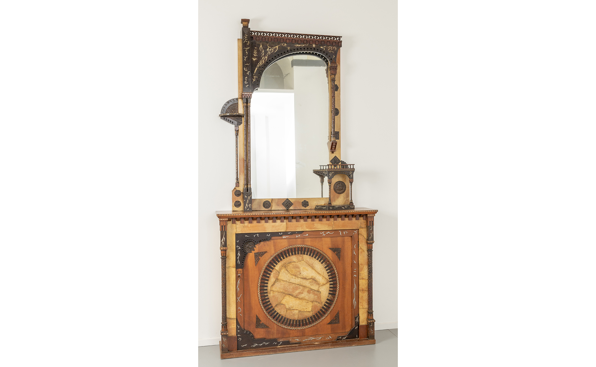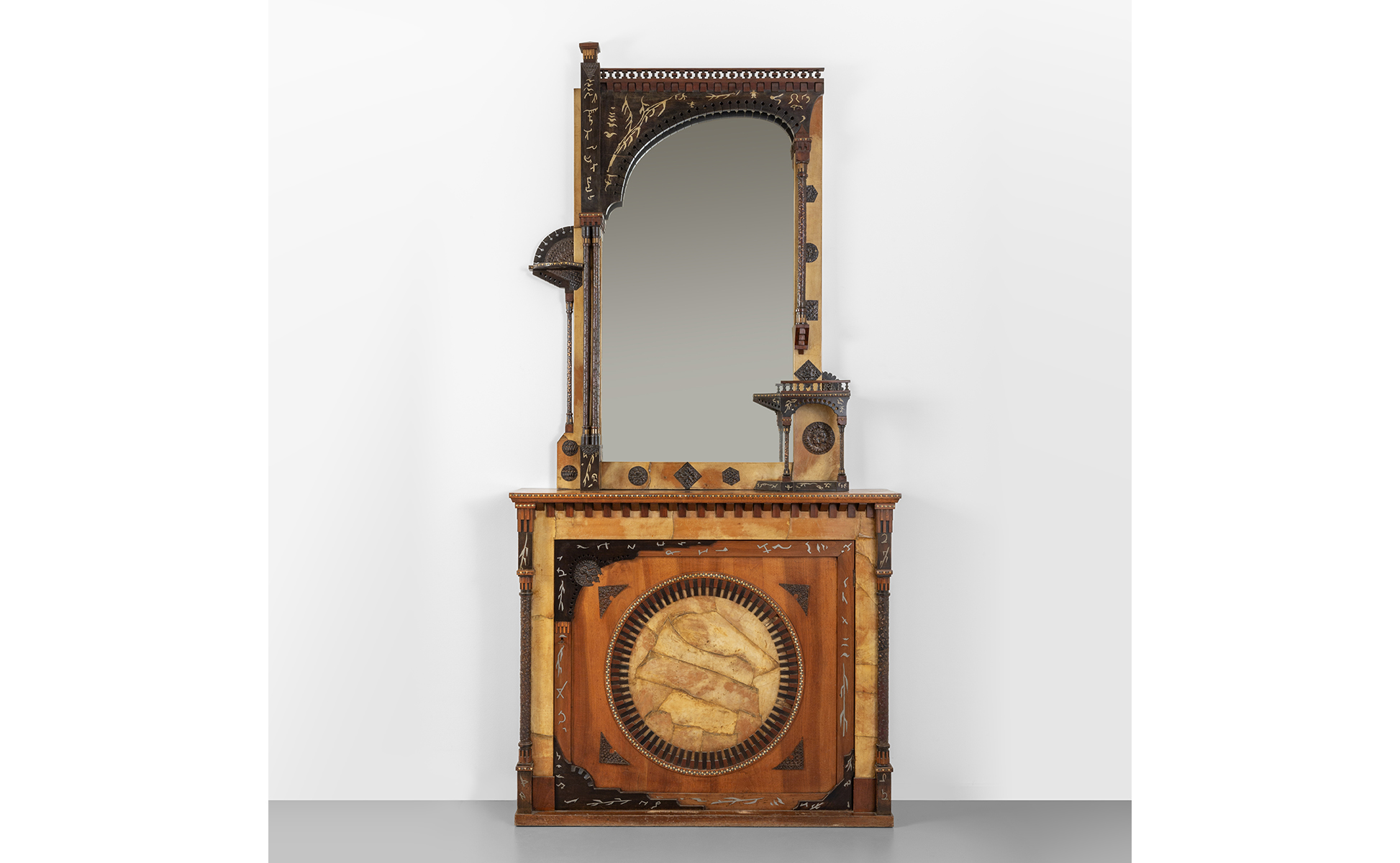Various types of wood with pewter inlays embossed copper parchment mirrored crystal.