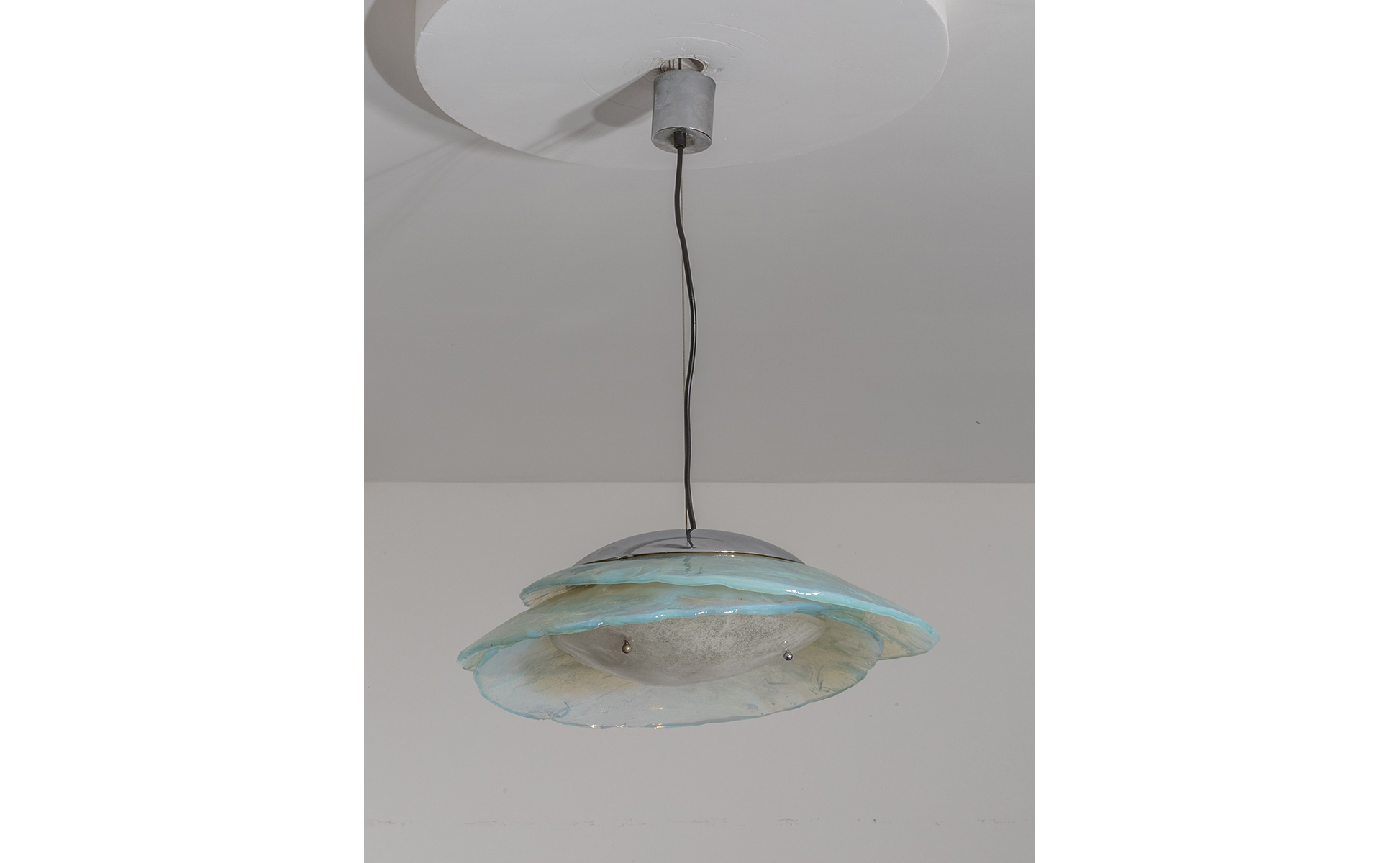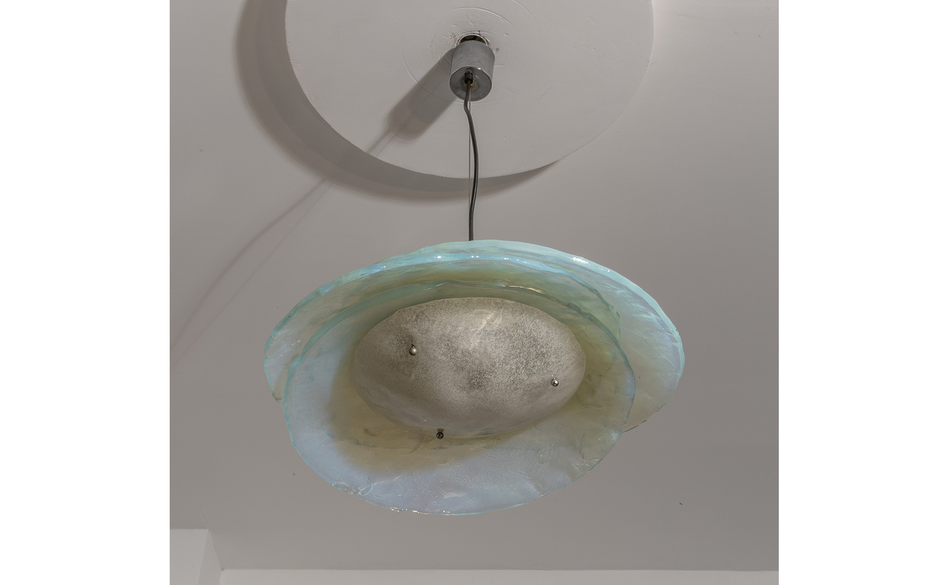 Vetro iridescente in piastra cristallo a bolle acciaio cromato.