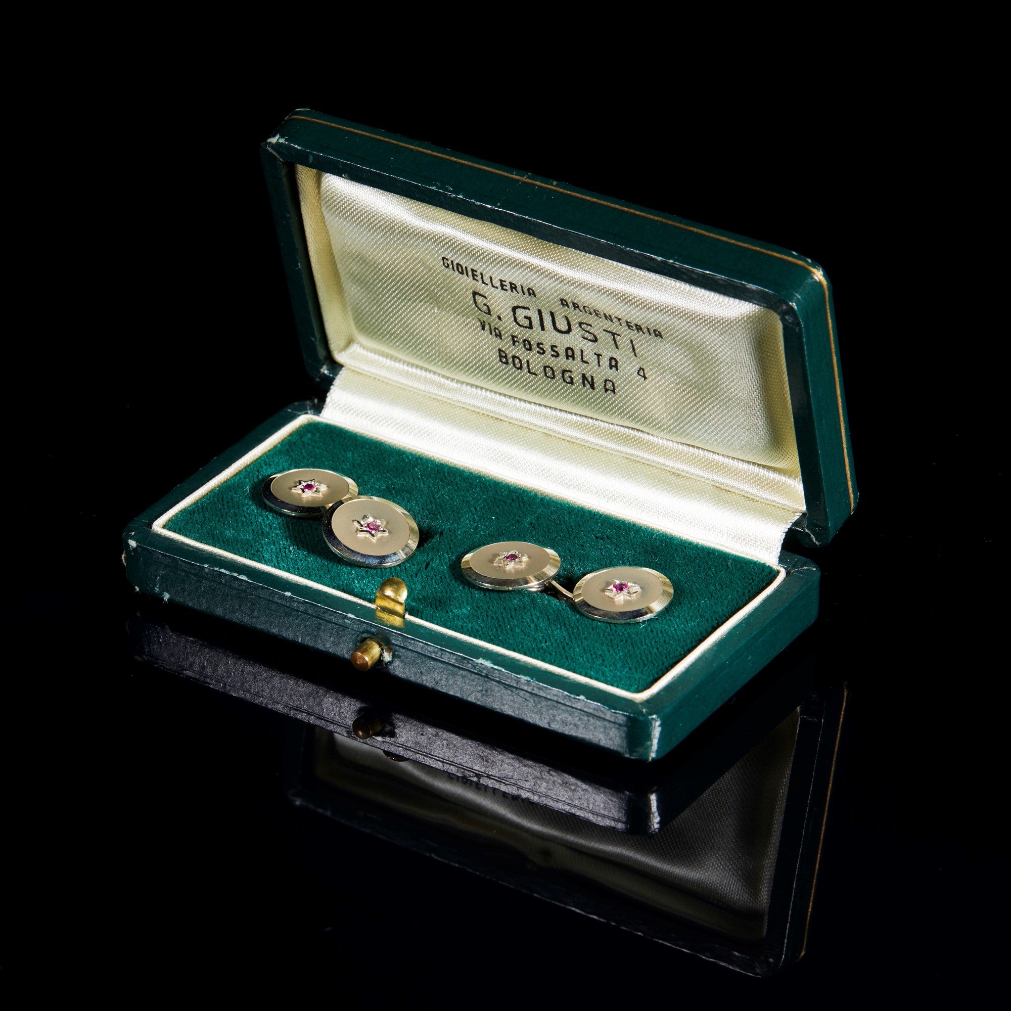 Gemelli in oro bianco decorati con piccole gemme rosse. Punzoni "750". Peso complessivo 9,5 grammi.