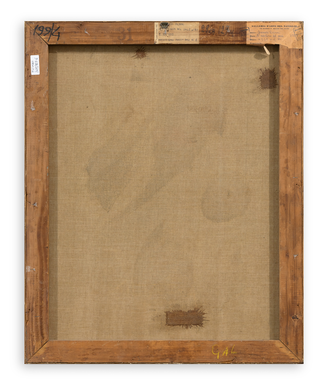 Timbri ed etichetta della Galleria d'Arte del Naviglio (MI), con caratteristiche tecniche dell'opera, al retro