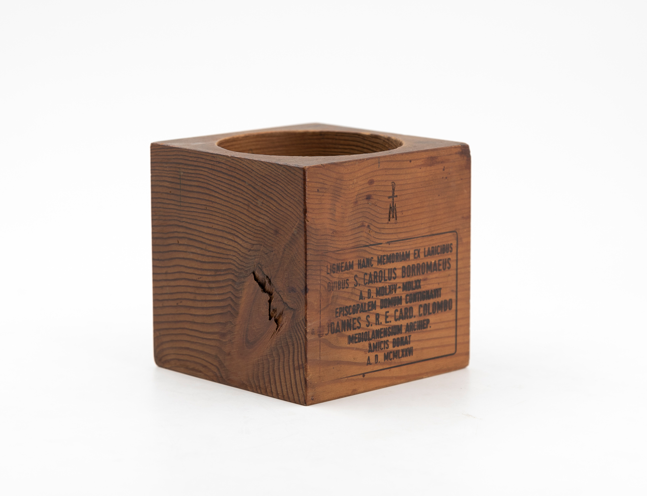 Porta gioie in legno recante iscrizione a fuoco 'Ligneam hanc memoriam, ex laricibus quibus S. CAROLUS BORROMAEUS A.D. MDLXIV – MDLXX episcopalem domum contignavit, JOANNES S.R.E. CARD. COLOMBO Mediolanensium Archep. amicis donat A.D. MCMLXXVI'