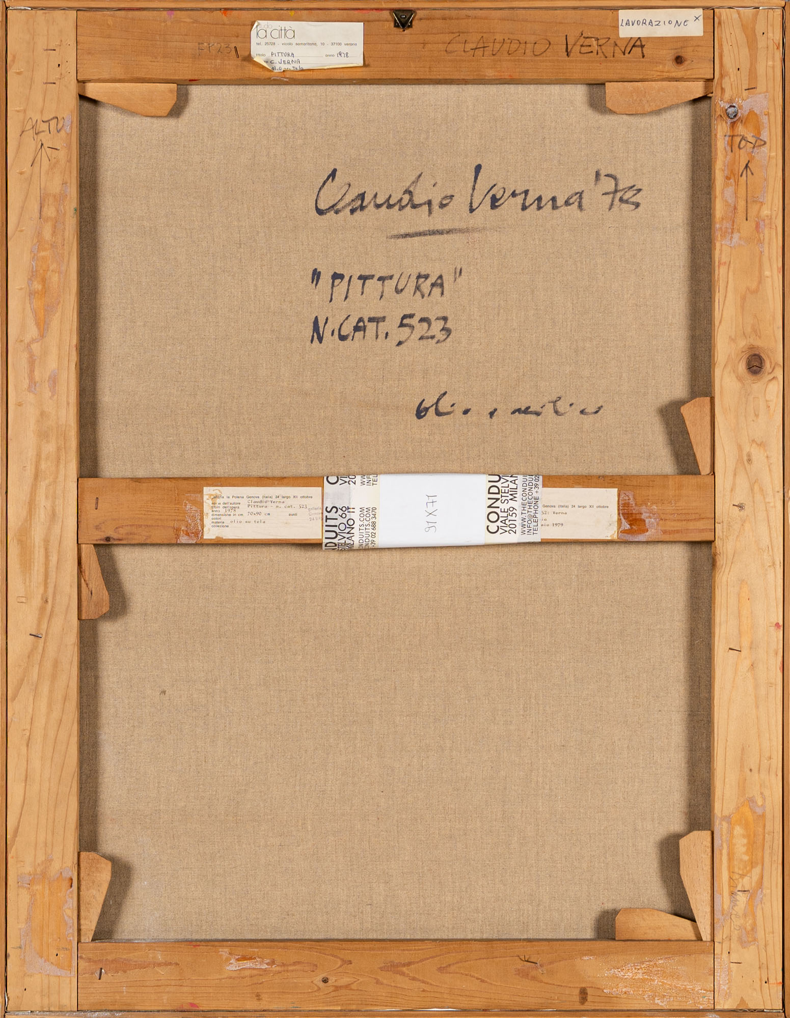CLAUDIO VERNA(1937)Pittura1978Olio e acrilico su tela90 x 70 cmFirma, data e titolo al retroOpera accompagnata da certificato di autenticità a cura dell'Archivio Claudio Verna, Roma e firmato dall'artistaPROVENIENZA:Galleria La Polena, Genova (etichette e timbro al retro)Studio La Città, Verona (etichetta al retro)Flash Art MuseumCollezione privata, MilanoESPOSIZIONI:2 dicembre 1978 - 8 gennaio 1979, Claudio Verna. Mostra personale, Studio La Città, Verona7 novembre - 1 dicembre 1979, Claudio Verna. Mostra personale, Galleria del Milione, Milano (riprodotto a colori sull'invito della mostra)BIBLIOGRAFIA:V. W. Feierabend, Claudio Verna. Catalogo ragionato, Silvana Editoriale, Cinisello Balsamo, 2010, N.CAT. 523, p. 360 (ill.)M. Fagiolo, Claudio Verna, Politi Editore, Milano, 1979 (in copertina)