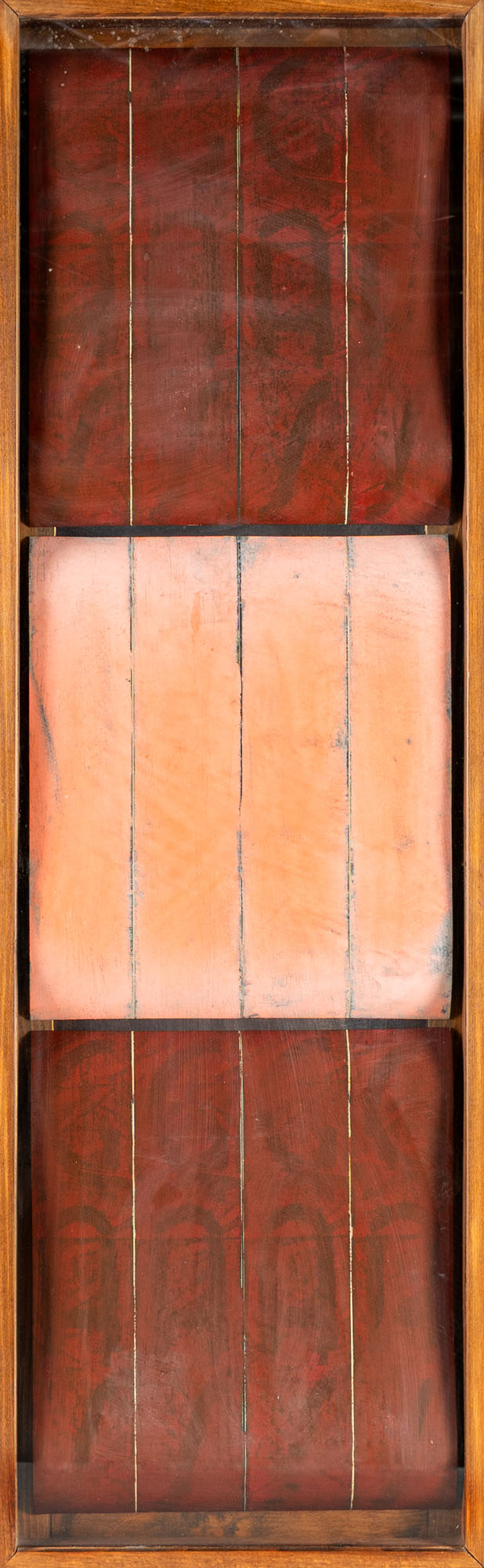 ALFREDO PIRRI(1957)Gas1990Olio su carta tipografica entro cornice d'artista159 x 49,5 x 6 cmI lavori a parete sono interamente realizzati sulla carta degli inviti della mostra torinese, dove c'era scritto 'gas'. E' un atteggiamento ecologico nei confronti del proprio lavoro, un non voler sprecare le cose una volta fatte. Sopra i fogli tipografici sono intervenuto con dei colori realizzati tutti a mano. Sono terre o materiali mantecati e tritati nell'olio di lino.PROVENIENZA:Collezione privata, Milano (ricevuta direttamente dall'artista)ESPOSIZIONI:1990, Disciplinam pone in corde tuo, Studio Casoli, Milano