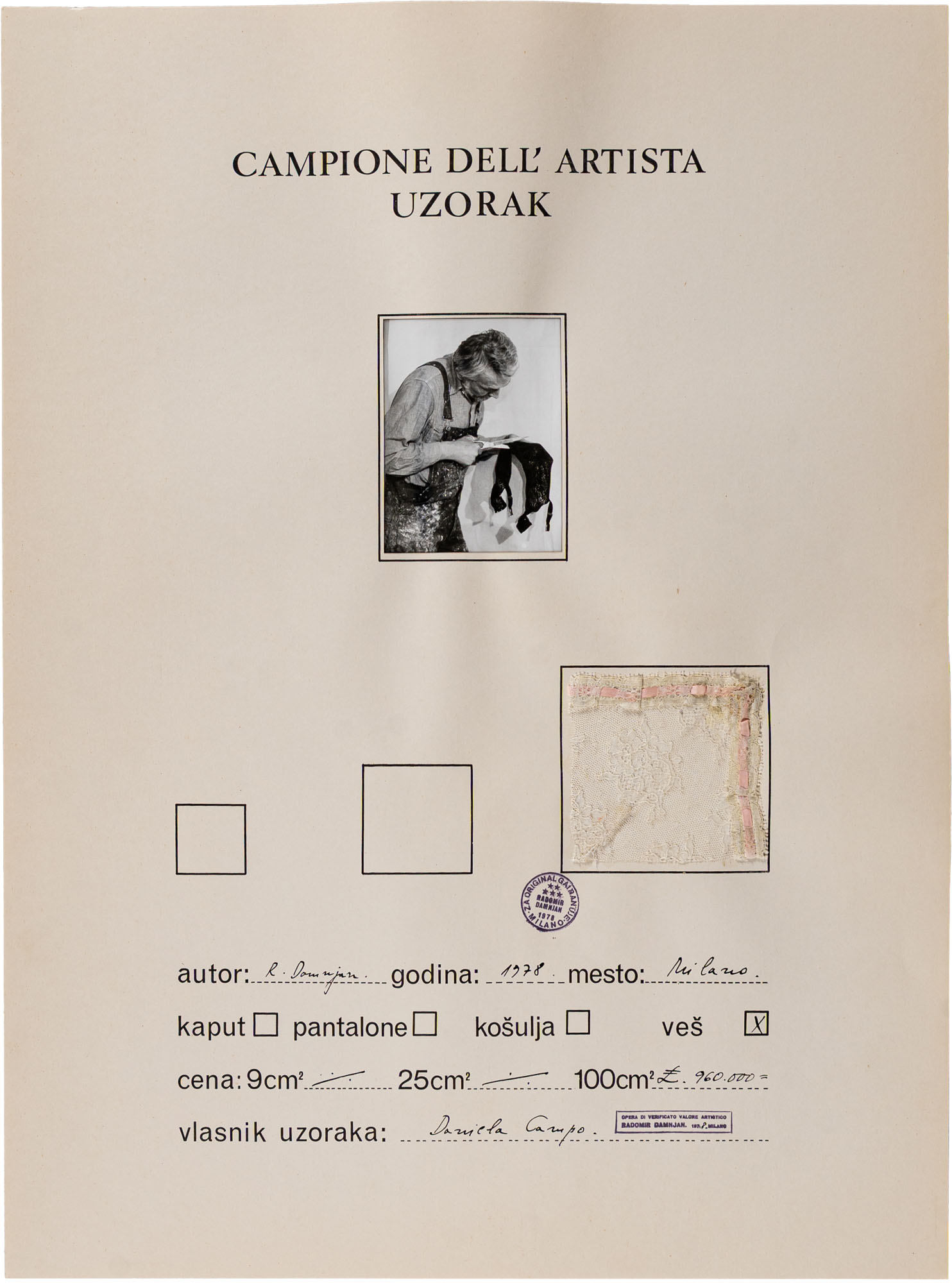 RADOMIR DAMNJANOVIC DAMNJAN(1935 - 2025)Campione dell'artista - Uzorak1978Formulario, china e collage con fotografia e tessuto su stampa serigrafica65 x 48 cmFirmata e datata in basso al centroTimbro dell'artistaL'autenticità dell'opera è stata confermata dalla moglie dell'artista e futura presidente del costituendo archivioPROVENIENZA:Collezione privata, MilanoBIBLIOGRAFIA:J. Denegri, T. Trini, Radomir Damnjanovic Damnjan, Federico Bianchi Contemporary Art, Milano, 2010, p. 276 (ill.)