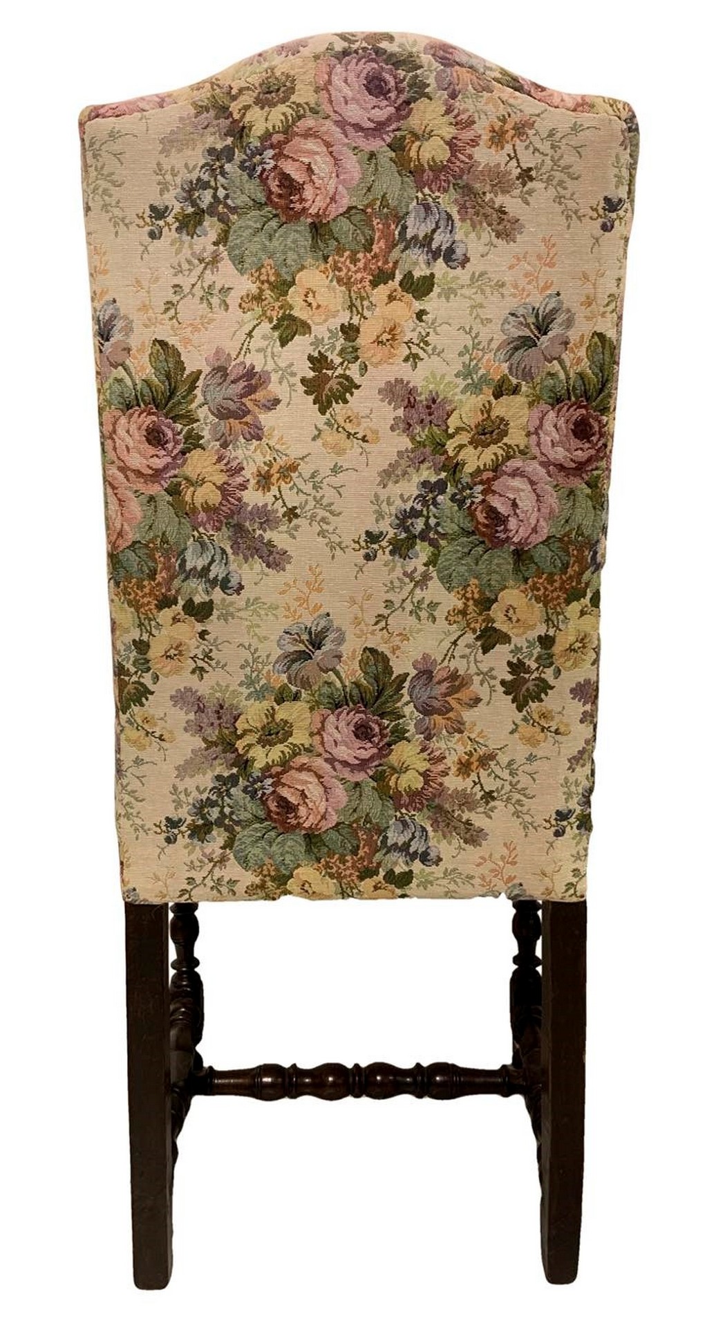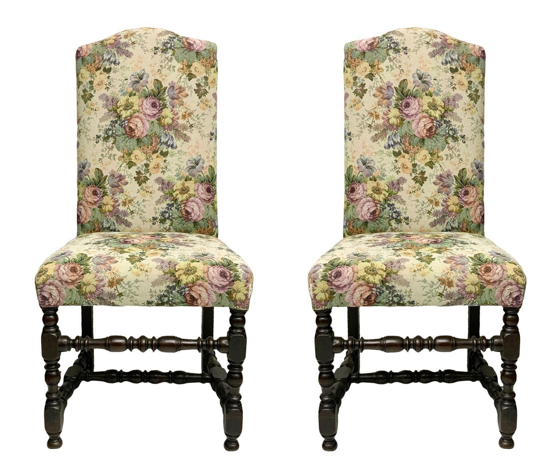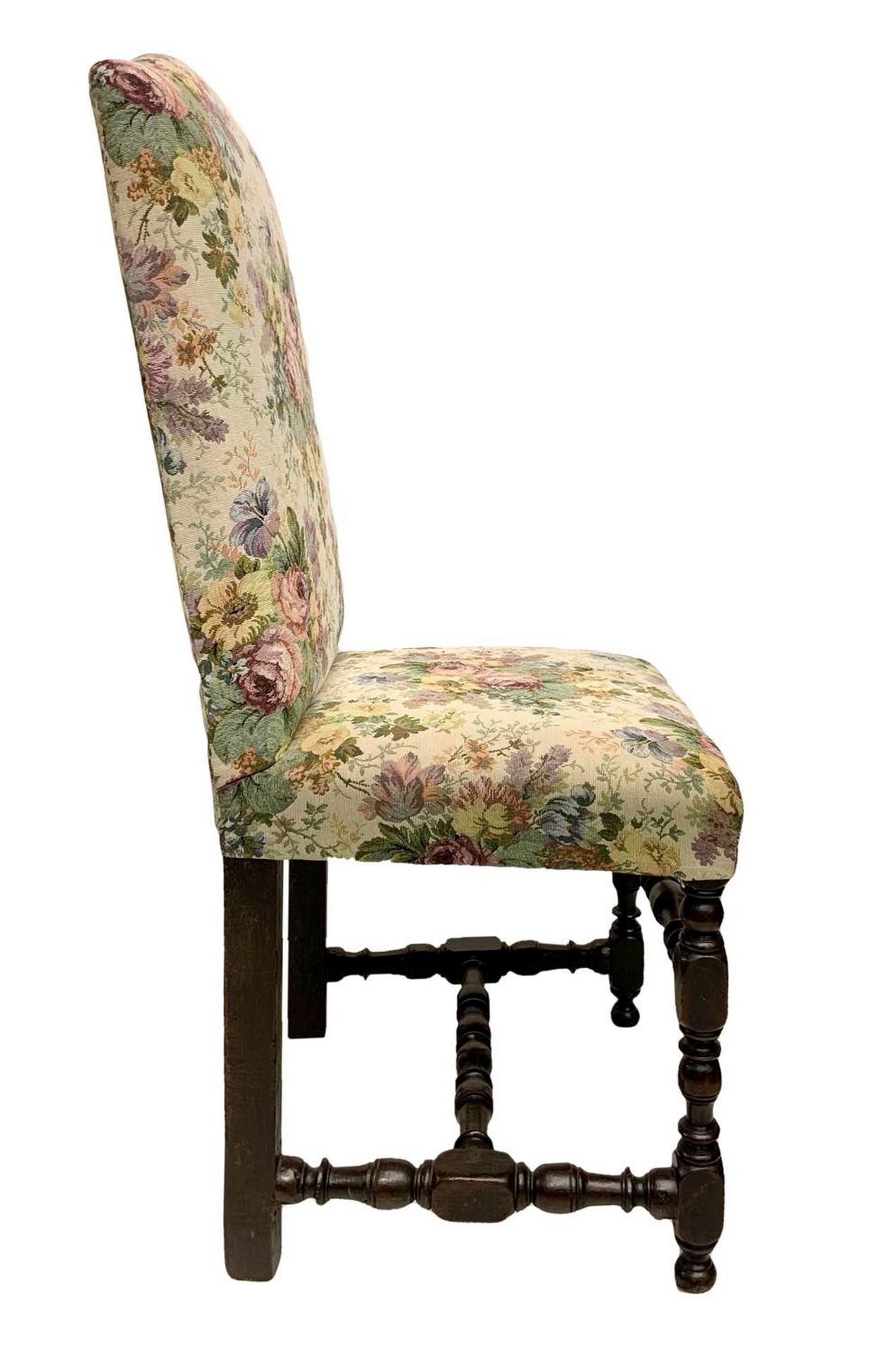 Coppia di seggioloni, Lombardia, Italia, 18° secolo H 144x55x50 Schienale alto mosso nella sommità. Gambe tornite a rocchetto con piede a cipolla, collegate ad H da un traversa tornita. Seduta e spalliera imbottita con tapezzeria floreale in ottime condizioni.