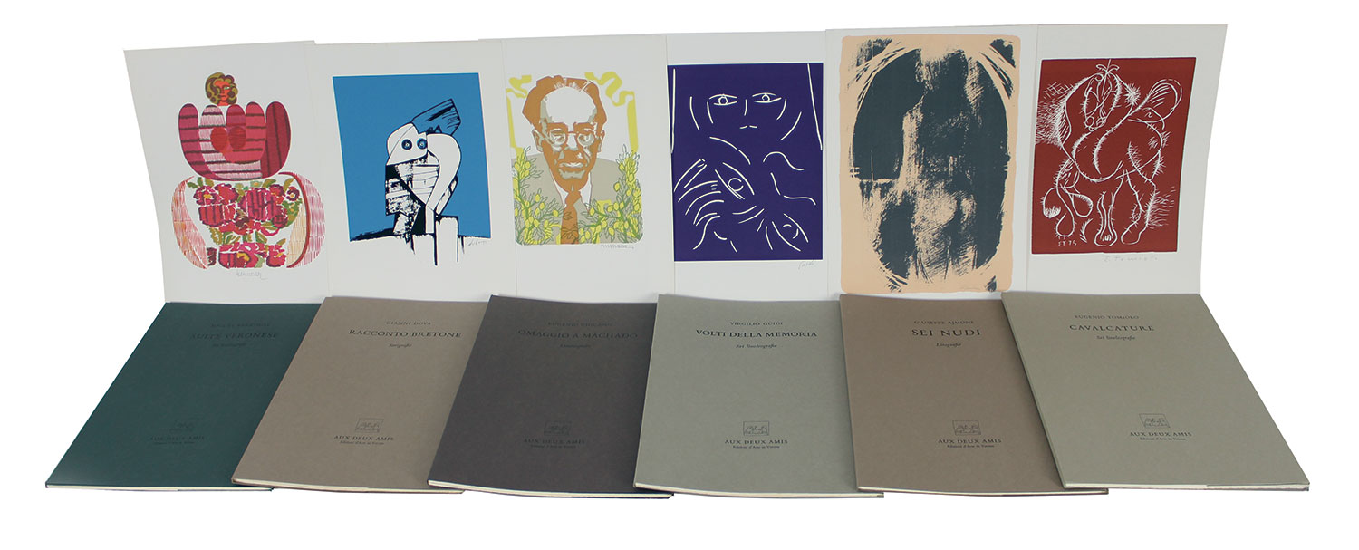 AA.VV. 6x6+6 Racconti Grafici, 1975 cartella contenente 6 volumi numerati con all'interno 6 incisioni ciascuno (cm. 33,5 x 24,5), una firmata e con timbro a secco degli editori e le altre 5 con firma in lastra, Ajmone Giuseppe - Berrocal Miguel - Cicano Eugenio - Dova Gianni - Guidi Virgilio - Tomiolo Eugenio, Aux Deux Amis Edizioni d'Arte di Verona